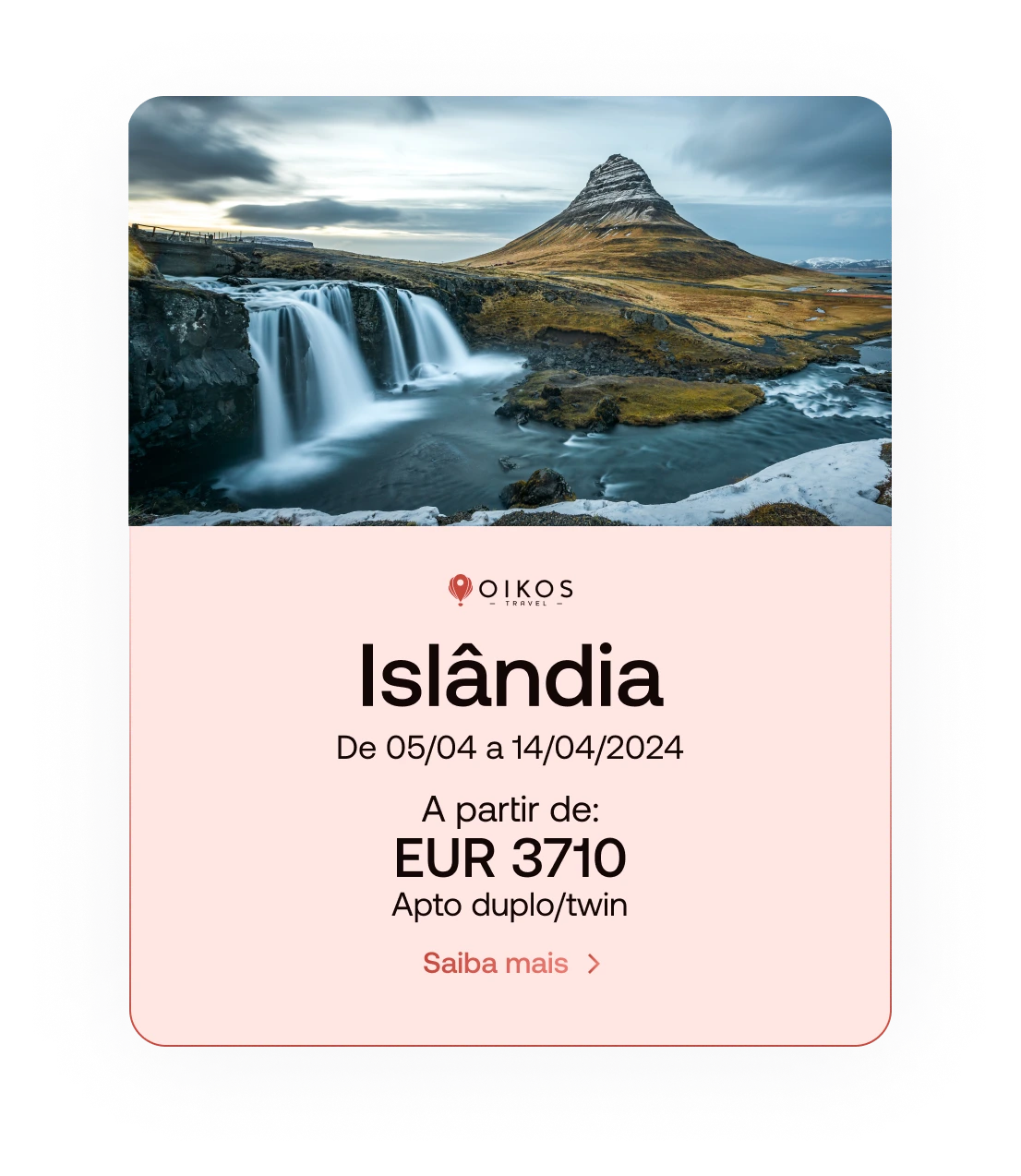 Explore os segredos da impressionante Islândia em uma jornada única, personalizada e projetada exclusivamente para brasileiros. Em nosso incrível Tour Islândia 360 graus, acompanhados por guias locais em português, visitaremos os destinos mais icônicos como a famosa Blue Lagoon, as deslumbrantes Luzes do Norte, o lendário Golden Circle e a bela Costa Sul com suas cachoeiras deslumbrantes e a incrível Caverna de Gelo Katla. Também desbravaremos o encantador Sudeste da Islândia, com suas impressionantes gargantas, a fascinante Diamond Beach e a imponente Lagoa Glacial. Aventuras emocionantes, como passeios de snowmobile nas geleiras, estão inclusas. Além disso, conheceremos lugares incríveis, como a pitoresca região de Viking Villa, a majestosa Aldeyjarfoss, a serena Lagoa Forrest e a deslumbrante Península de Snæfellsnes, inspiração literária na obra "Viagem ao Centro da Terra" de Júlio Verne. Esta viagem exclusiva proporcionará uma vivência única da cultura, da natureza e da magia da Islândia, combinando atividades de verão e inverno. Reserve agora e embarque nessa jornada extraordinária para descobrir a essência da Terra do Gelo e Fogo com a Oikos Travel.
